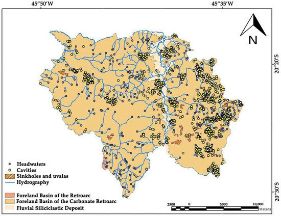 Coromandel and Vazante are two municipalities located in the Triângulo Mineiro region in western Minas Gerais, based on the Bambuí speleological province, a complex karst system that encompasses several features, including endokarst (caves) and exokarst (sinks, sinkholes, and karst springs) (Figure 5) [53]. The region was named after its triangle-shaped territory and is one of the most important in terms of economy for the state. Historically, the exploitation and settlement of the area was mostly done by the slaving and extermination of indigenous populations and maroon communities (quilombolas) as it was in the entire Brazilian colony [53,54]. Additionally, the area is known for its impressive geological features, such as waterfalls, lakes, mountains, and caves, along with geotourism activities related to leisure and contemplation of those features. At the same time, mining is one of the main economic activities developed in the area, followed by agriculture-related industries and business [54].