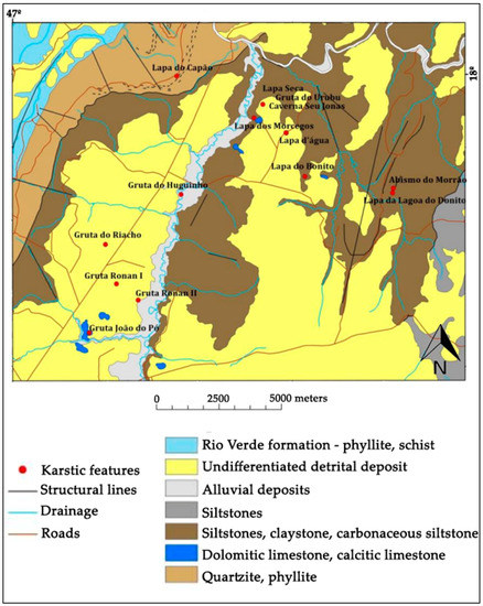 - Teixeira-Silva, C.M.; Duque, T.; Rosa, M.; Renó, R.; Lucon, T.N.; Aquino, I.; Bragante-Filho, M.; Silva, L.A.; Carvalho, M.G.; Nunes, T.R.; et al. Domínios espeleogenéticos da região de Arcos-Pains-Doresópolis (MG, Brasil). In Congresso Brasileiro de Espeleologia 32; Anais Campinas: SBE: Barreiras, Brazil, 2013; pp. 381–390. [Google Scholar]