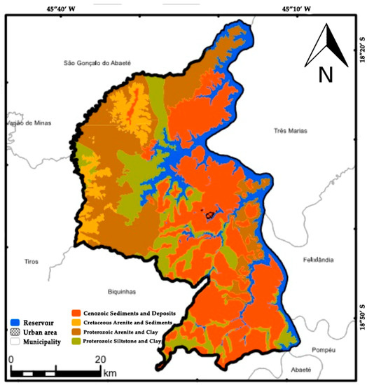 Situated in the Bauru basin, which constitutes effusive rocks with an alkaline character [63], the topography of the area is primarily smooth, composed of monotonous undulations, broad hills, dominated by watercourses with an area greater than 4 square kilometers, extensive and flat tops, slopes, and unique geological units [62,63].