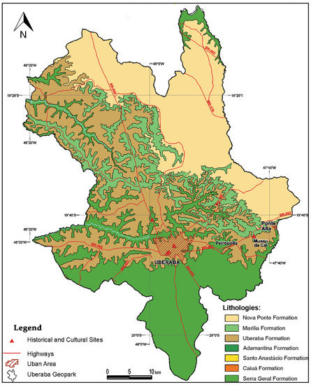 - Santos, W.F.; Carvalho, I.S.; Fernandes, A.C.S.; Ribeiro, L.C.B. O Patrimônio Mineiro em Uberaba, Minas Gerais (Brasil): Potêncial para uso geoturístico. In Memórias e Notícias; Universidade de Coimbra: Coimbra, Portugal, 2008; n 3—Nova Série. [Google Scholar]