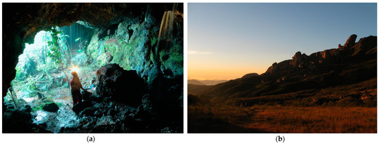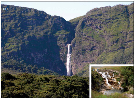 The landscape is characterized by the presence of a rich biodiversity and outstanding aesthetic values, such as many native species and the vegetation mainly based in cerrado, patches of the Atlantic Forest, and rupestrian fields [45,47]. Not only does the region draw attention for its biodiversity, but its geodiversity and geoheritage provide an unusual variety of international geological significant elements, such as hydrographic features (many springs, waterfalls, rivers, and streams), archeological, and monumental sites, such as the Casca d’Anta waterfall, which is approximately 186 m high and one of the park’s main attractions, and the Chapadão da Canastra (or Diamante), which is a set of mountains and plateaus resulting from geological processes and phenomena that date back to the Proterozoic, ranging from 900 to 1500 m in height (Figure 4) [47].