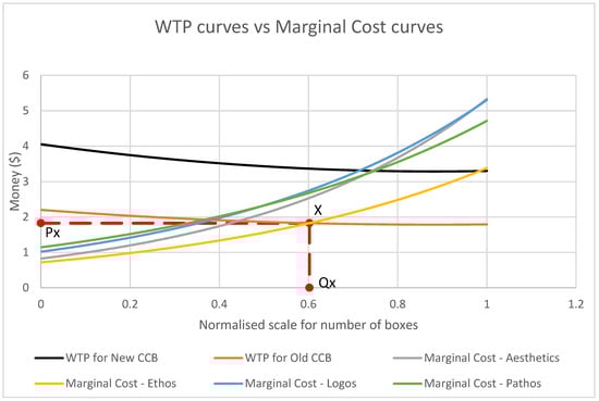 The marginal cost curves are evaluated from the database collected for the previous survey [1]. In this survey, the authors asked 13 quantitative questions related to incentives with the help of specific persuasion techniques. Thus, a mean of 13 quantitative questions was taken for each of the 92 participants and categorized them with respect to persuasion techniques. Therefore, there are four marginal cost curves for aesthetics, ethos, logos, and pathos. To plot the WTP and marginal curves, the number of boxes (x-axis) is normalized from 0 to 1. The marginal cost curves show the relation of money to acquire more boxes via the “reuse” cycle. The willingness to pass curve shows the relation of money to consumers buying the number of boxes. Thus, Figure 3 below shows WTP and marginal cost curves for CCB.