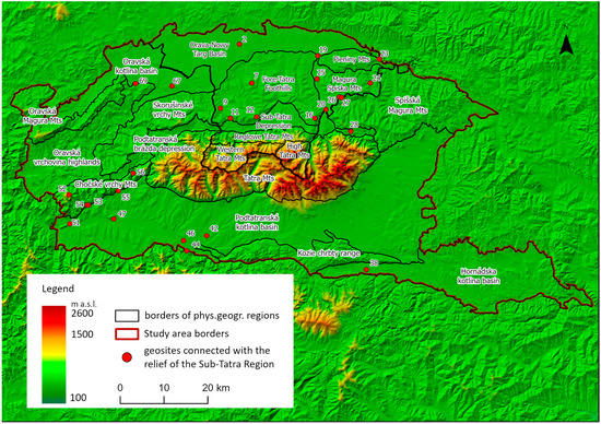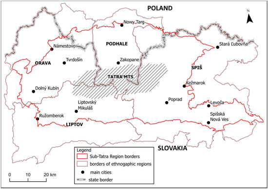 The Sub-Tatra Region is located in the Western Carpathians, around the highest Carpathian massif—the Tatra Mountains. The borders of the region described in this article were determined based on physical geographical units, which are described in more detail later in the article. However, this area is also within four ethnographic regions lying on the Polish–Slovak border: Podhale, Orava, Liptov and Spiš (Figure 1). The unique highlander culture, which is the most important feature of these ethnographic regions and is manifested in, among other things, the architecture, is also visible directly or indirectly at the analyzed geosites.
