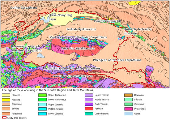 The Sub-Tatra Region is very diverse in terms of geological structure, relief, and hydrology. Geologically, it is an area that was last shaped during the Alpine orogeny. In terms of individual geological units, various rock types can be distinguished. The Podhale Synclinorium, which is part of the Paleogene of the Central Carpathians, is made of flysch, i.e., alternating layers of sandstones clay shales and mudstones [59,60,61,62]. Mesozoic units of the Inner Carpathians, which build, for example, the massif of the Choč Mountains and Kozie Chrbty Ridge, are built of carbonate rocks: various limestones and dolomites [62,63,64,65]. Various carbonate rocks also build the structures of the Pieniny Klippen Belt [66,67,68,69]. The youngest (Miocene) sedimentary rocks line the Orava–Nowy Targ Basin [70,71,72]. There are also igneous rocks (andesites and basalts) in the Pieniny Klippen Belt margin as a result of igneous intrusions that took place in the Miocene [66,73,74]. Finally, the crystalline core of the Tatra Mountains is made of various crystalline rocks such as gneiss, granite, and crystalline shales [62,63,65,75] (Figure 2).