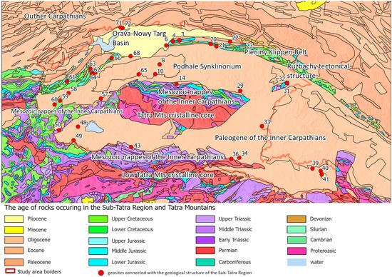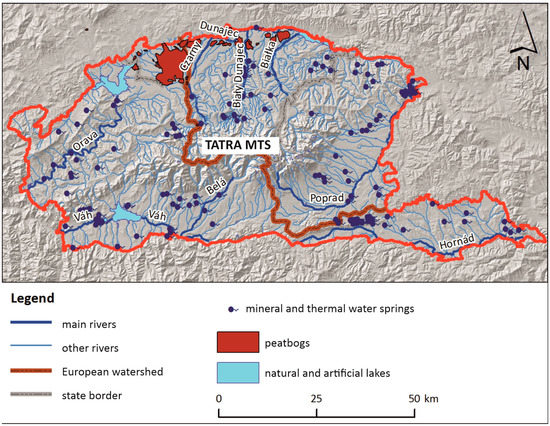 The main European watershed separating the catchment areas of the Baltic and Black Seas runs through the Sub-Tatra Region. The longest rivers draining this area are: the Czarny and Biały Dunajec, the Białka, the Poprad, the Hornad, the Váh, the Belá and the Orava [79,93,94]. Due to the diverse geological structure, the occurrence of deep and shallow fault faults, and the topography, there are a large number of thermal and mineral springs in the Sub-Tatra Region [95].