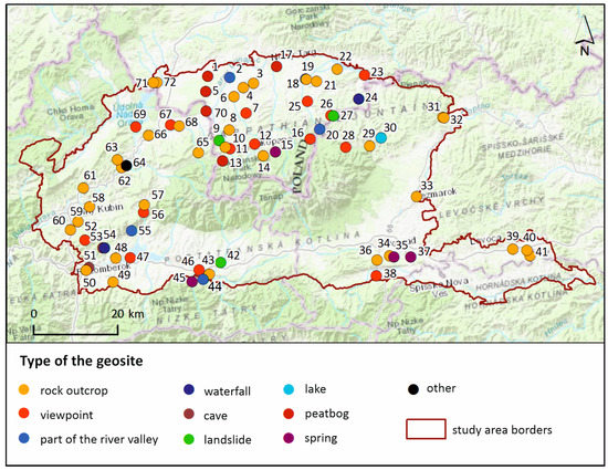 An inventory of geological outcrops, relief forms, hydrological objects and viewpoints performed in the Sub-Tatra Region in the years 2012–2016 identified 225 objects. A further, detailed field inventory consisted of collecting observations on their geological, geomorphological and/or hydrological values and in assessing the conservation status and forms of protection, transport accessibility, tourist infrastructure and additional tourist attractions. This led ultimately to 72 geosites being identified, including objects related to natural and anthropogenic geological outcrops (35), various relief forms (12), and, moreover, natural and anthropogenic hydrological objects (10) and viewpoints (15) (Figure 5). Detailed descriptions of these geosites have already been published [111,112,113].