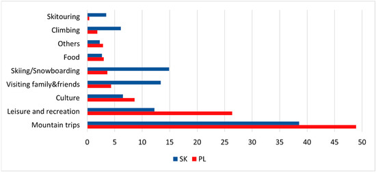 Most of the surveyed respondents, both from Poland and Slovakia, declared that their purpose of staying in Sub-Tatra Region was mountain trips (Figure 8), although in the case of Polish tourists, this answer was chosen by fewer than 50% of people. A quarter of Polish respondents also declared rest and recreation as the main purpose of their stay. Other destinations were rarely chosen, and tourists the next most frequently chosen was that they come to Sub-Tatra Region to commune with highlander culture and folklore (9%). Slovak respondents, after mountain trips, declared that skiing or snowboarding and visiting friends and family are equally important goals of their trips to the Sub-Tatra Region. They also go there to learn about the local culture and folklore and to practice mountaineering (Figure 8). The surveys show that, for Slovaks, Sub-Tatra is less a holiday and recreation region, and more often a place of active tourism.