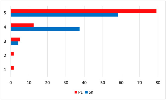 The choice of equipment-intensive tourism in the Sub-Tatra Region by Polish and Slovak respondents was confirmed by them in the declaration that the form of recreation in the “womb of nature” is very important (5) and important (4) for them (on a 5-point Likert scale; Figure 12). This is the opinion of 95% of the people surveyed, both from Poland and Slovakia.
