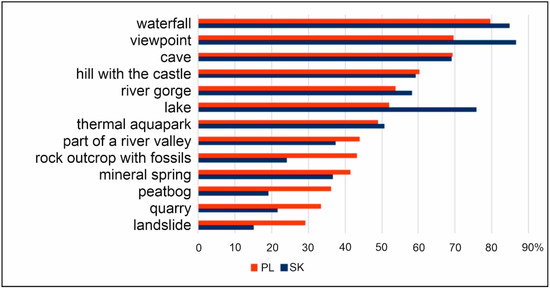 The main purpose of this survey was to analyze the respondents’ preferences relating to the degree of attractiveness of various features of abiotic nature. It was possible to select more than one object. In this ranking, among people declaring trips to the “womb of nature”, the diversity of answers was large, ranging from 15% (landslide) to 85% (viewpoint). Details are summarized in Figure 13. Waterfalls, viewpoints, caves, hills with castle ruins, river gorges and lakes were the most frequently chosen objects visited by the tourists, which were more than 50% more popular than other types of objects. Landslides, quarries, and peatbogs were the least frequently selected. There are differences between the answers of Polish and Slovak respondents for waterfalls, viewpoints, river gorges, and lakes, with Slovak tourists choosing these attractions between 5% and 24% more often than Polish tourists. On the other hand, respondents from Poland prefer interesting sections of river valleys, rock outcrops with fossils, mineral springs, peatbogs, quarries, and landslides. For features such as caves, hills with castle ruins and thermal aqua parks, the preferences of both Polish and Slovak respondents are similar (Figure 13).