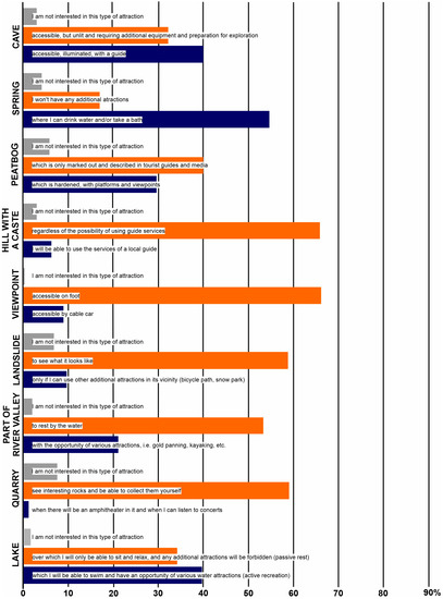 The answers of Polish and Slovak respondents were summed up, and this section presents a collective analysis of the expectations of tourists participating in the study in the field of geosite development. The questions posed to the respondents were aimed at evaluating the extent to which additional stimuli that attract people to various types of geosites are important for tourists. As expected, there is a difference in expectations in this regard, but it is not large. Among the various objects, there are those that are in and of themselves a “magnet” for this type of tourism. In the opinion of over 50% of respondents, these include hills with castles, viewpoints, interesting sections of river valleys, and rock outcrops with fossils in quarries (Figure 14). Only a few types of geosites, according to the surveyed respondents, require various forms of development to motivate them to travel to such places. These include caves, mineral springs, and lakes (Figure 14). Comparing the opinions of Polish and Slovak tourists regarding the expectations of additional incentives (appropriate development) for travel in the “womb of nature” there are no major differences. The exceptions are preferences relating to the development of peatbogs, landslides, rock outcrops in quarries and sections of river valleys. In the case of peatbogs, landslides and sections of river valleys, Slovak respondents prefer developed facilities that offer additional attractions, in contrast to Polish tourists, who are satisfied with a description of the path marked out through a peatbog, a description of a landslide or a passive rest by a river. On the other hand, in the case of rock outcrops in quarries, almost a quarter of Slovak respondents did not consider them worth visiting, and most would visit them provided they could participate in additional attractions, e.g., a concert. For Polish respondents, such places were interesting in and of themselves, and they would be happy to visit them just to see interesting rocks and fossils, and preferably to find and collect them on their own.