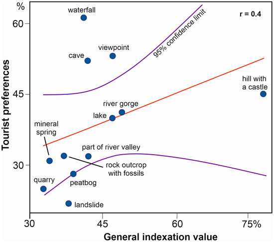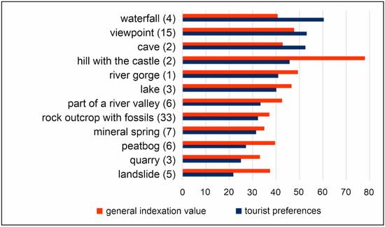 The purpose of this research was to compare the geotouristic potential of the Sub-Tatra Region, expressed in the values of expert assessment of geosites, against the preferences of tourists coming to the area. Tourist preferences were evaluated by a survey in which tourists assessed the attractiveness of the types of geosites that can be admired in the area. The expert valorizations showed high and very high indices for most of the analyzed geosites. The highest of these assessment values show particularly high geotourism values for three geosites: the travertine hill with Spiš castle, the limestone hill with Orava castle and the travertine dome in Gánovce. A comparison of these results against average tourist preferences shows a moderate correlation (r = 0.4). Geosites of low and medium value according to expert assessments are rarely selected as the destination for equipment-intensive tourism. The sites with the highest combined valorization coefficients, i.e., hills with castle ruins, are of moderate interest to the surveyed group of respondents. The largest difference is in the assessment of the cave, waterfall and viewpoint geosites, where there is a great interest among tourist respondents, but the expert assessment index is low or moderate.