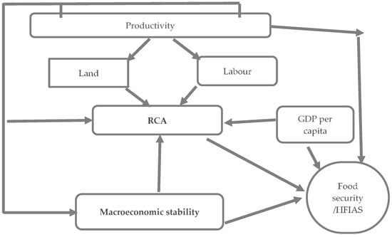 In Figure 1, concepts are understood and developed based on the data patterns and not by collecting data to evaluate the hypothesis. Still, the study also emphasizes the research’s validity through an empirical approximation. The model includes an RCA and LFI indicator as a dependent variable, while explanatory variables include land and labor productivity, GDP per capita, and macroeconomic stability. From the food security implication aspect, the model includes the HFIAS indicator as a dependent variable, while explanatory variables include RCA and LFI, land and labor productivity, GDP per capita, and macroeconomic stability.