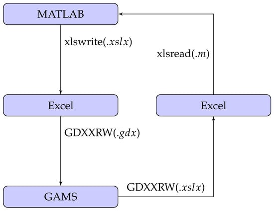To interconnect both interfaces, it is necessary to consider the file compatibility of both programs [51]. In this regard, the Excel software is used as an intermediary to ensure an effective exchange of information between MATLAB and GAMS. Thus, the interfaces are interconnected via files, through which the data necessary for the evaluation of the MINLP model defined in Section 2 are sent and received. However, as shown in Figure 1, it is necessary to use a function that allows for the reading and writing of these files in the software, as mentioned earlier.