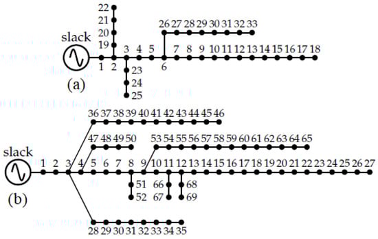 Electrical scheme of the test feeders: (a) IEEE 33-node and (b) IEEE 69-node.