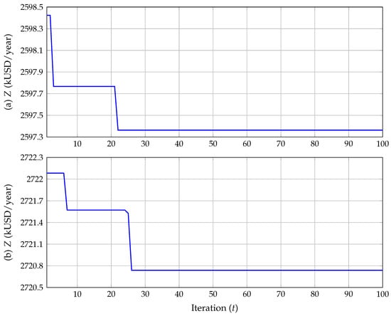 To show the convergence behavior of the proposed DSCA-BONMIN approach in solving the problem studied herein, Figure 5 shows how the value of the objective function evolves as the number of iterations increases for the IEEE 33- and 69-bus systems.