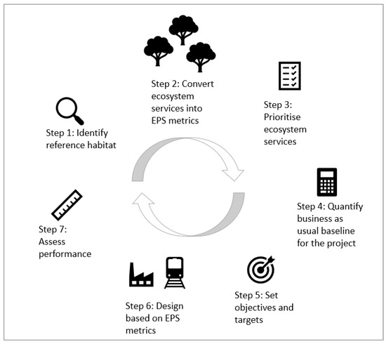 This provided insights into current practice, knowledge gaps, and alignment with existing regulations and voluntary frameworks. The second activity was structured around the seven EPS process steps outlined in Figure 1, namely: (1) identify reference habitat, (2) convert ecosystem services into EPS metrics, (3) prioritise ecosystem services, (4) quantify BAU design baseline, (5) set objectives and targets, (6) design based on EPS metrics, and (7) Assess performance.