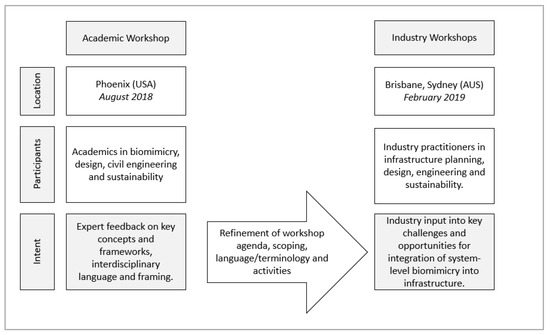 The workshop process allowed for outcomes from the initial academic workshop to refine the workshop protocol for the industry-focused sessions that followed. The structure is outlined in Figure 2 and expanded below.