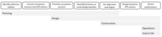 In the planning phase, the priority process steps identified were: identify reference habitat, convert ecosystem services to EPS metrics, prioritise ecosystem services, and set objectives and targets. At the design phase, the priority was to further prioritise the list of ecosystem services and select a subset of services to focus on, to quantify the business-as-usual design baseline, refine objectives and targets, and design based on the EPS metrics. This also included some assessment of projected performance against the design objectives. For construction, the priorities were to assess performance, and to a lesser extent, to set and refine objectives and targets, and to design based on EPS metrics. In operation, the focus was on assessing performance, and at end of life there was a continued yet decreasing prioritisation of performance assessment.