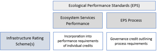 The proposed approach to integrating EPS is through existing infrastructure sustainability rating schemes such as CEEQUAL, Envision, IS Rating Scheme and the Living Community Challenge [4,5,10,36]. While these schemes vary in structure and scoping, categories and content have many alignments. Content developed for one scheme could be largely transferrable to other schemes with minor adjustment, including building sustainability rating schemes such as Green Star and LEED [11,37].