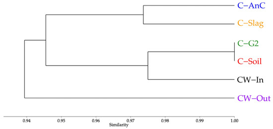 Unweighted pair group method with arithmetic mean (UPGMA) cluster tree based on unweighted UniFrac distance. C−AnC (AnC sludge)—bottom layer of the CEvaT; C−G2 (gravel no. 2)—middle layer of the CEvaT; C−Soil (soil)—top layer of the CEvaT; C−Slag (blast-furnace slag)—top layer of the CEvaT; CW−In (fine gravel)—initial middle layer of the CW; and CW−out (fine gravel)—final middle layer of the CW.