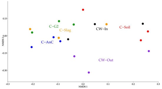 Nonmetric multidimensional scaling (NMDS) analysis. See Figure 2 for the definitions to the abbreviations. Blue dot: C−AnC; green dot: C−G2; red dot: C−Soil; orange dot: C−Slag; black dot: CW−In; and purple dot: CW−out.