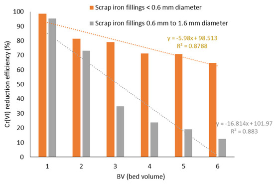 The experimental investigation revealed that the creation of the iron oxide coating due to iron species oxidation with Cr(VI) has a profound effect on Cr(VI) reduction efficiency. As evident in Figure 1, Cr(VI) reduction efficiency in experimental setups linearly decreased in relation to the treated water volume, as expressed in terms of the bed volume (BV). This reveals the creation of a barrier between iron materials’ surface and water, which leads to the gradual passivation of iron materials.
