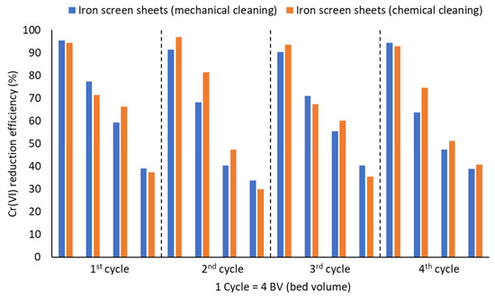 As shown in Figure 2, after the chemical or mechanical cleaning of iron sheet fillings, which was performed after four cycles (1 cycle = 4 BV of Cr(VI) of contaminated natural water treatment, the Cr(VI) reduction efficiency was restored from values below 50% to values over 90%.