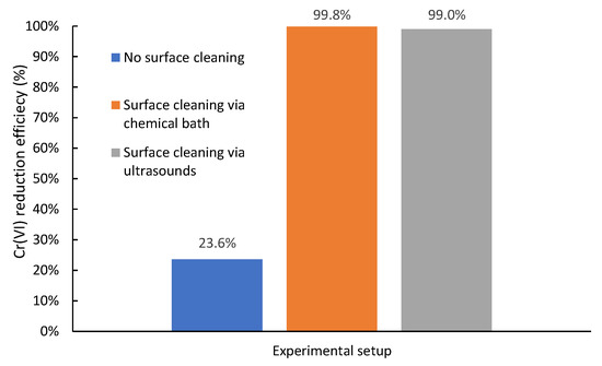 As evident in Figure 3, the reduction efficiency of Cr(VI) by Fe0 reaches values over 99% when regeneration via the application of ultrasounds or chemical cleaning is applied. Based on the presented experimental results, it is concluded that scrap iron or low-cost iron compounds could be used in a water treatment process at low environmental and operational costs. Moreover, periodic mechanical cleaning, preferably via vibration upon ultrasound application, is suggested for the regeneration of iron materials used for Cr(VI) reduction. Based on the data from the experimental sonication configuration setups, a rough cost estimate of sonication for the regeneration of iron screen fillings is approximately 0.83 USD m−3 by taking into account an energy cost of 0.25 USD kWh−1. It should be mentioned that this cost is calculated at the imposed operational conditions of sonication configuration. Further studies should be undertaken to find the optimal conditions for regenerating iron materials via sonication.