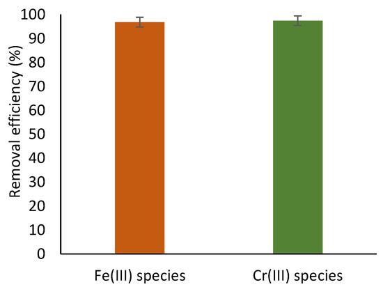 It is worth mentioning that at pH > 4, the Cr(III) precipitates in the presence of Fe(III) as a solid solution of brown color with the general chemical formula Crx Fe1-x(OH)3 (most possible Cr0.25Fe0.75(OH)3, which is an enmeshing agent for chromates [29,30,31]), assisting in Cr(VI) removal. At pH levels that are commonly encountered in natural waters, the resulting Cr(III) and Fe(III) species precipitate as insoluble species, presenting their maximum precipitation rate at pH levels of approximately 7 and 8, respectively [32,33]. Thus, depending on the pH of an aqueous solution, either the Cr(III) or the Fe(III) could enhance the precipitation of Cr0.25Fe0.75(OH)3 due to co-precipitation phenomena, which further assists in the removal of Cr(VI) contaminants.