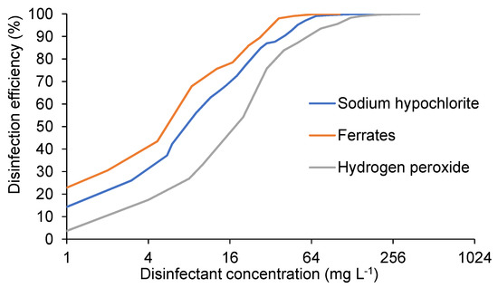 The disinfection efficiency of ferrates was assessed in comparison to two commonly applied chemical disinfectants: sodium hypochlorite (NaClO) and hydrogen peroxide (H2O2). There was no pH adjustment during the application of the three disinfectants; thus, their efficiency was evaluated with unbuffered aqueous solutions with pH 7.1 to 7.8. As evident in Figure 6, ferrates presented the highest disinfection efficiency in relation to the chemical dosage regarding the treatment of biologically treated wastewater samples from the dairy industry. There is an evident logarithmic relationship between disinfectant concentration and disinfection efficiency, as is evident from the graphs of Figure 6 that are plotted on a base-4 logarithmic X-axis. This means that the higher the dosage, the lower the disinfection efficiency gain.