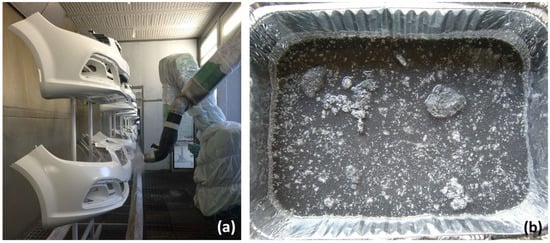 The painting operation of vehicle bodies at large automobile factories is generally carried out in a series of cabins called paint spray booths (Figure 1a). Although automotive spray painting is an automated operation, its efficiency is still quite low, since approximately 40% to 50% of the employed paint escapes into the surrounding air in the form of a mist, not reaching the target [3]. The excess paint mist is called “overspray”. Such an overspray is typically collected by means of a water curtain or wet scrubbing, and the resulting fluid is thereafter collected through the floor grating beneath the paint booth. The mixture of water and paint compounds is conveyed using suction systems to appropriate reservoirs, namely sludge pits, and processed for water recovery [4]. Paint overspray and the residual water, which remains after water recovery, are usually referred to as PS (Figure 1b).