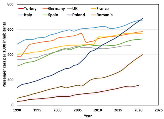 Trend of passenger cars per 1000 inhabitants in the biggest European countries (1990–2021) [8].