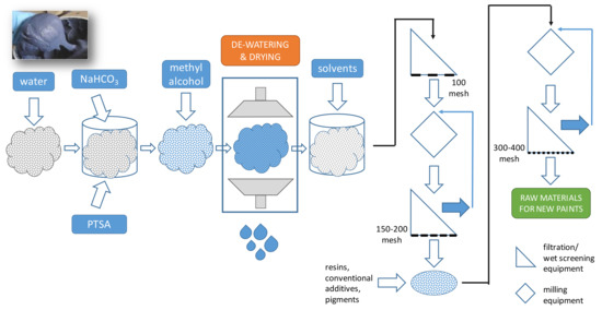 As shown in Figure 3, the process for the production of new paint from PS started with a rinse of the wet sludge with water. PS was subsequently mixed with a solution of either sodium bicarbonate (NaHCO3, 3–10% b.w. of the PS), if the booth additive was acidic, or paratoluene sulfonic acid (PTSA, 0.2–0.5%), if the booth additive was alkaline. After a subsequent rinse with methyl alcohol, the residual liquid phase, which wetted the sludge, was removed with pressing, centrifugation, or mild heating. The complete removal of the liquid phase was obtained with a drying operation carried out at a temperature range from 35 to 75 °C (or at room temperature) for a period between 1 and 72 h, depending on the sludge condition and quality.