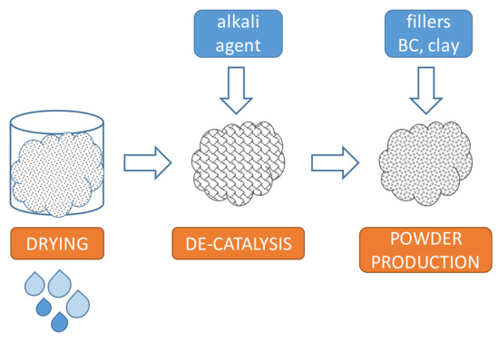 The phase of drying had to be preferably carried out by agitating the raw sludge under vacuum at a temperature of approx. 110 °C. These operating conditions determined the removal of a substantial amount of water and low-boiling solvents from the PS, thus leaving the polymers uncured. In the second phase, PS underwent a treatment of de-catalysis with an alkali agent (which was selected from di-ethanolamine, 2-amino-2-methyl-2-propanol, di-isopropanol amine, tri-isopropanol amine, potassium hydroxide (KOH), and sodium hydroxide (NaOH)) capable of guaranteeing a pH ranging from 8 to 13. The dose of the added alkali agent ranged from 0.1% to 10% of the PS’s dry weight. In the de-catalysis phase, the catalyst contained in the PS was neutralized so that the curing component was not activated upon heating. In the presence of a solvent-based PS containing polyester, acrylic, and melamine resins, the above-described process produced a putty. Finally, in the third phase, putties were converted into powders by the addition of 5–75% b.w. of processing fillers, namely black carbon (BC), clay, or a mixture thereof.