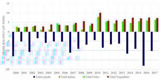 Comparing the exports by crop category with the imports from 2000 to 2017, it can be found that fruits and vegetables are net exporter crop categories. Their net exports were in a rising trend year by year and increased from 2.67 and 2.11 million tons respectively in 2000 to 6.38 and 7.31 million tons in 2017 (Figure 3). Their aggregate net exports in the seventeen years achieved respectively 72.32 and 94.46 million tons.