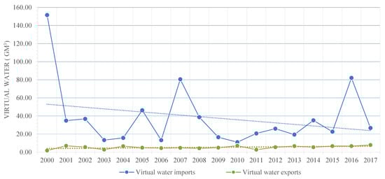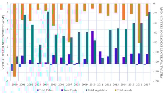 With regard to the virtual water embedded in the pulses category (Table A1 in Appendix A), chickpeas were the main virtual water exporter. The amount was approximately 117 Hm3 from 2000 to 2017, accounting for 85% of the total volume of virtual water exported in the pulses category. The second was dried lentils with approximately 20.30 Hm3, accounting for 15% of the total volume of virtual water exported in this category.