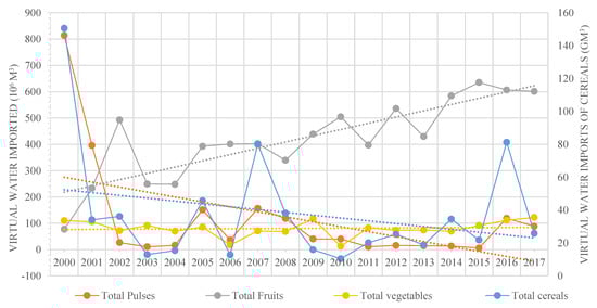 With regard to the virtual water embedded in the pulses category (Table A2 in Appendix A), dried lentils were the main virtual water importers. The amount was approximately 2.01 Gm3 from 2000 to 2017, accounting for 97% of the total volume of virtual water exported in the pulses category. The second was chickpeas with 58.87 Hm3.