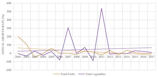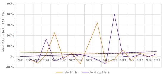 The tendency of imported virtual water was on a rising trend as a whole in the fruits and vegetables categories. The highest imported virtual water volumes of fruits and vegetables during this period were respectively 635.27 Hm3 reached in 2015 and 122.22 Hm3 reached in 2017. The lowest volumes were respectively 77.39 Hm3 reached in 2000 and 12.94 Hm3 reached in 2010 (Figure 7). In addition, as is reflected in Figure 8 and Figure 9, the virtual water imports and exports through the imports of vegetables increased at a growing rate. However, the average annual growth rate of virtual water imports (45%) was higher than that of virtual water exports (26%). Regarding fruits, the exported virtual water through fruit exports rose at an increasing rate, and the virtual water imports rose at a decreasing rate. The average annual growth rate of virtual water imports of fruits was 22% while that of virtual water exports was 33%.