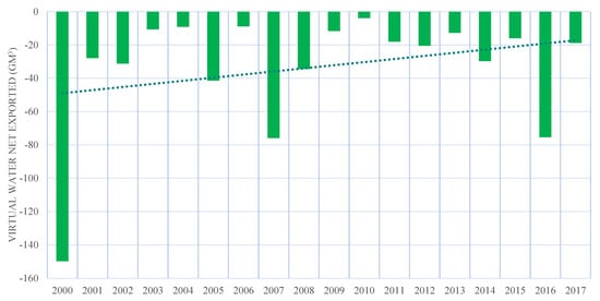 Our calculations show that the virtual water that Morocco exported to the world during the period 2000–2007 was 95.03 Gm3. The amount was 1.73 Gm3 in 2000 and 7.86 Gm3 in 2017. The exported virtual water flows had little inter-annual changes and the tendency of total virtual water export was on a rising trend (Figure 5). The highest volume was recorded in 2017. That is because fruit and vegetable exports, which are water-intensive agricultural commodities, significantly increased during the period 2010–2017 (Figure 4). Therefore, there was a significant pulling effect of these crop products on Morocco’s virtual water export.