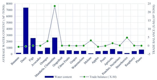 As is illustrated in Table A1 in Appendix A, the top five fruits in terms of virtual water exports were mandarin and clementine (19,819.31 Hm3, 77%), apricots (1572.86 Hm3, 6%), strawberries (1479.36 Hm3, 6%), oranges (1104 Hm3, 4%), and melons (578.60 Hm3, 2%). The virtual water embedded in these products accounted for approximately 26% of the total volume of the exported virtual water embedded in the crop categories studied.