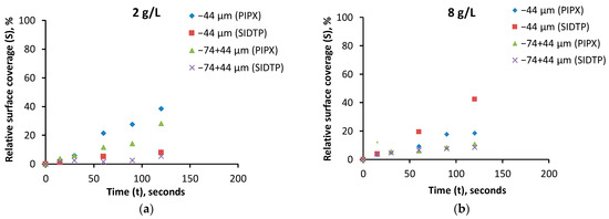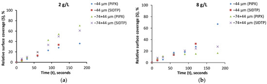 The relative surface coverage of the bubbles with non-activated sphalerite particles increased gradually with conditioning time. Within 15–30 s, the surface areas of the bubbles for both collectors were similar. Initially, at low concentrations of collectors (0.01%), the size of particles and nature of collectors insignificantly affected attachment kinetics (see Figure 5a,b). The differences appeared at conditioning times of t ≥ 60 s. At water salinity of 2 g/L and the collector concentration of 0.01%, the surface coverage of the bubbles increased in the following order: −74 + 44 μm (SIDTP), −44 μm (SIDTP), −74 + 44 μm (PIPX), −44 μm (PIPX), indicating the strong collector performs better than the weak one. Moreover, we can observe that the slimes are more readily attached to the bubbles than −74 + 44 μm sphalerite. Although at the salinity of 8 g/L, the slimes performed better than the sphalerite fractions of −74 + 44 μm, the effect of SIDTP on the surface coverage of the bubbles with the slimes was significantly higher than PIPX. Moreover, we observed similar trends in surface coverage of the bubbles with −74 + 44 μm fractions for both collectors at the salinity of 8 g/L. In general, at collectors’ concentration of 0.01%, PIPX promoted attachment of −44 μm sphalerite particles to air bubbles in the sea water with a salinity of 2 g/L, whereas SIDTP performed better at the salinity of 8 g/L.