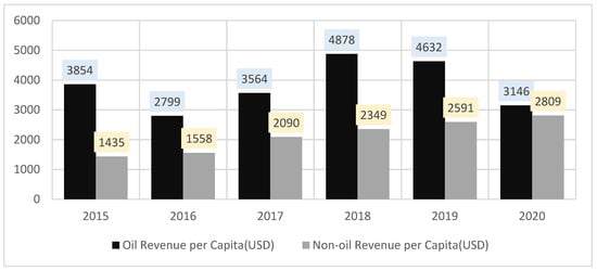 Saudi Arabia ranked third in crude oil production globally in 2021, with production reaching 9.125 million barrels per day, accounting for approximately 13.10 percent of global production. Due to the so-called “great shutdown” caused by COVID-19 in 2020, crude oil production decreased by 6.1% and oil exports decreased by 5.4% []. In addition, Saudi Arabia’s nominal GDP in 2021 exceeded 833.5 billion US dollars, making it the eighteenth largest economy in the world and 0.87 percent of the global economy.