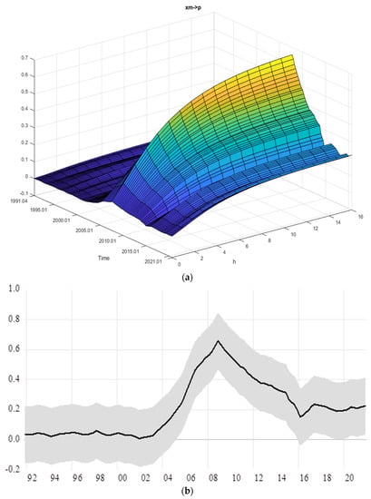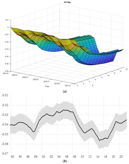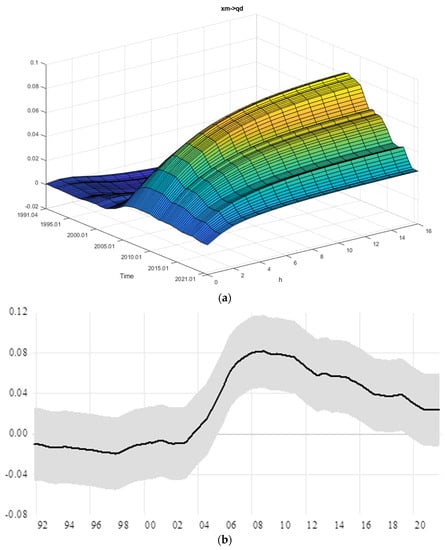 After investigating the convergence of the parameters, the time-varying responses to oil shocks are calculated based on the variance-covariance matrix of the TVP-VAR model. In Figure 2, Figure 3, Figure 4 and Figure 5, we plotted the cumulative time-varying responses of trade balance to the shocks based on two different illustrations. In each figure, panel (a) shows the surface plot including a three-dimensional representation of the cumulative responses for the time horizon t = 0 to 16, while panel (b) shows the accumulated responses over the sixteenth-quarter horizon, h = 16th, along with the confidence bands, in order to evaluate the significance of the shocks over the examined period.