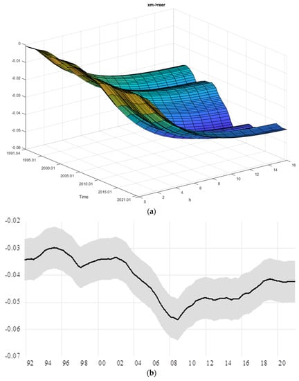 Time−varying cumulative responses to the real exchange shocks. (a) Time−varying cumulative responses; (b) Time−varying cumulative responses at h = 16 with ±2 standard error bands.
