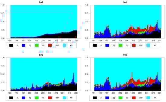 In addition to the impulse response analysis, the time-varying variance decomposition analysis is performed to assess the relative importance of oil and real exchange rate shocks in affecting the trade balance of Saudi Arabia. Figure 5 presents the time-varying variance decompositions of the trade balance at h = 1, 2, 4, and 8 quarter-ahead horizons. In general, the results of the forecast error decomposition are consistent with the results of the time-varying impulse responses. Overall, it is worth noting that most fluctuations in the trade balance are explained by the own shock of the variable. However, it is observed that the explanatory power of other shocks fluctuates substantially over time.