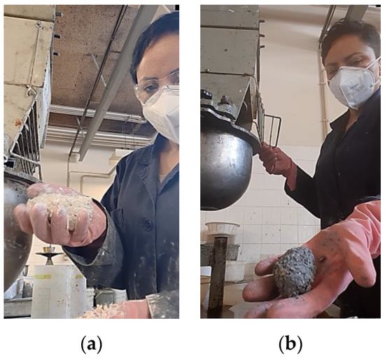 The procedures of the mixture preparation were based on Murphy et al.’s [22] research, where no pre-treatment of hemp wetting was carried out since they did not contribute significant benefits to the properties. The binders were mixed in their powder presentation, and then a part of water was added until a pasty consistency was obtained. Then, the aggregates were added gradually, until the paste covered the aggregates during an average mixing time of 6 min, evaluating the consistency of the mixture with the manual elaboration of a ball. If the ball maintained the shape and presented good cohesion, it meant that the workability of the material was adequate to produce the specimens, as has been used by Sousa to aid in the verification of the adhesion of materials [37], see Figure 3.
