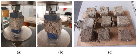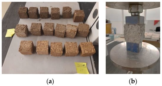 In the case of hemp concrete, there are no standards to evaluate its mechanical resistance. This study takes the BS EN 1015-11 2019 [41] (Compression) standard. Adjusting the conditions of the material with an application of 20N/s by displacement of the force applied on the specimen until the rupture of the same. For the application of this test, specimens of 50 × 50 × 50 mm were tested with a curing time of 28 days (3 specimens for each mixture). The Figure 4 shows the specimens before the test and one during the test.