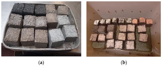 The method to evaluate the effect of the salt vapor consisted of testing the mechanical resistance to compression, taking up the BS EN 1015-11 2019 [41] standards (compression), and comparing the results with those of the samples that were not subjected to this test with the same curing time. Weight control was performed at the beginning and at the end of the test. For the application of this test, the dimensions of the specimens were 50 × 50 × 50 mm, with 3 specimens per mixture, see Figure 9.