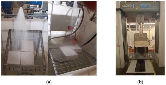 The effects were assessed by a mechanical flexural strength test, according to BS EN 1015-11 2019 (Flexure) [41], compared to samples that had not been subjected to this simulation, in addition to a weight control before and after the test. For the application of this test, the dimensions of the specimens were 150 × 150 × 50 mm, with 3 specimens for each mixture, with a curing time of 60 days. A coating of a dry mortar formulated from natural hydraulic lime was applied. Figure 8 shows the test process.