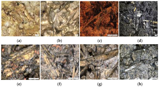 In the HL-ref concrete composition (Figure 10a), the hydrated lime adhered to the hemp particles and filled the spaces between them, making the mixture more cohesive. It was found that it was visible when there was greater coverage of the aggregates because there was better adhesion of the binder to these, and they provided better cohesion in the mixtures and in filling the voids. In the formation of the new composite, SCB pieces filled these spaces and bonded the hemp shavings together, creating a network between the spaces. It was also noted that the BD did not mix homogeneously with the rest of the binders, presenting small concentrations of BD (Figure 10c,f–h).